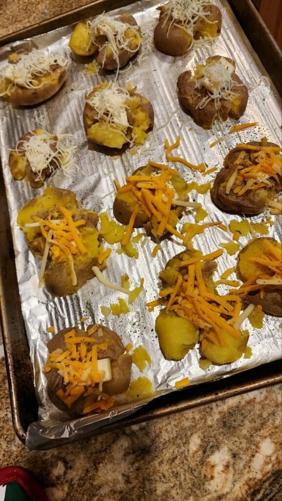 Now that they are smashed, let’s add the good stuff! First, add the butter. I place a small piece of the butter on each top of the potatoes and then I sprinkle the cheese on top of them.
